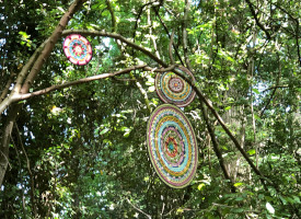 Nature-inspired mandala featuring earthy tones and organic patterns reminiscent of forest floors and woodland creatures.